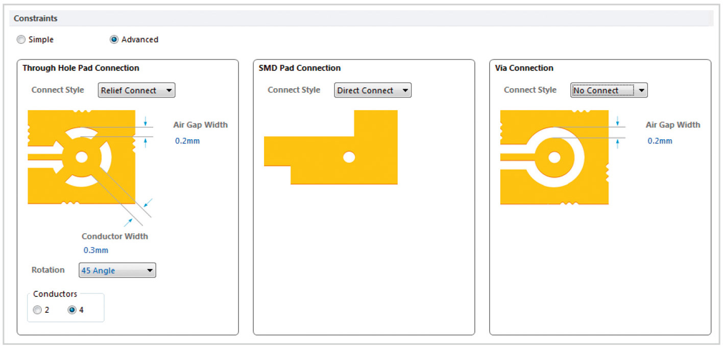Под выпадающим меню Connect Style расположено схематическое отображение стиля подключения. Для типов подключения Relief Connect и No Connect на схематичном отображении доступна опция Air Gap Width, с помощью которой задаётся ширина термального зазора. Для типа подключения Relief Connect доступен ещё ряд настроек. С помощью опции Conductor Width настраивается ширина проводников, с помощью которых полигон подключается к контактной площадке через термальный зазор. С помощью выпадающего меню Rotation можно выбрать, под каким углом проводники должны подходить к контактной площадке – 90° или 45°. Переключатель Conductors определяет количество проводников – 2 или 4 [6].