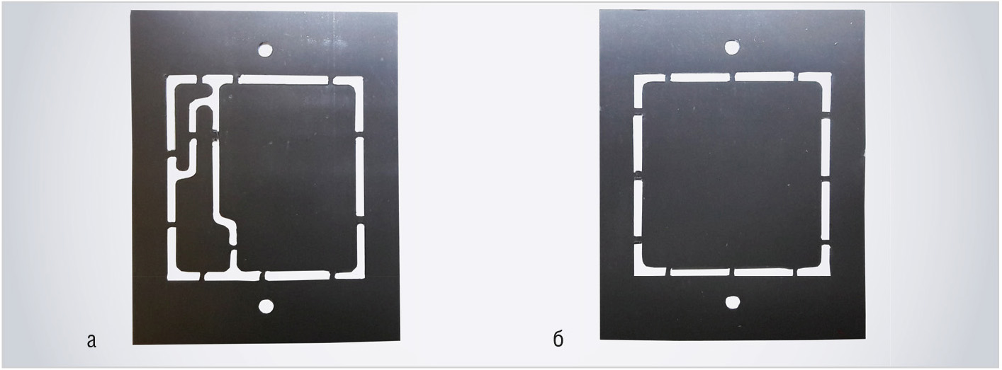 На рабочий стол установки укладывалась плёнка майлара, фторопласта или полиимида с нанесённым слоем металлизирующих плёнок толщиной 30–40 мкм. С помощью калибровочной пластины толщиной 5 мм выставлялся зазор между головкой лазера и плёнкой, а затем устанавливалась скорость резки 15 мм/с. Вырезанные заготовки (см. рис. 8) с топологическими рисунками укладывались в полиэтиленовый пакет, выдерживались под грузом для выравнивания и предотвращения деформирования, после чего передавались для нанесения металлизирующей плёнки на подложку.
