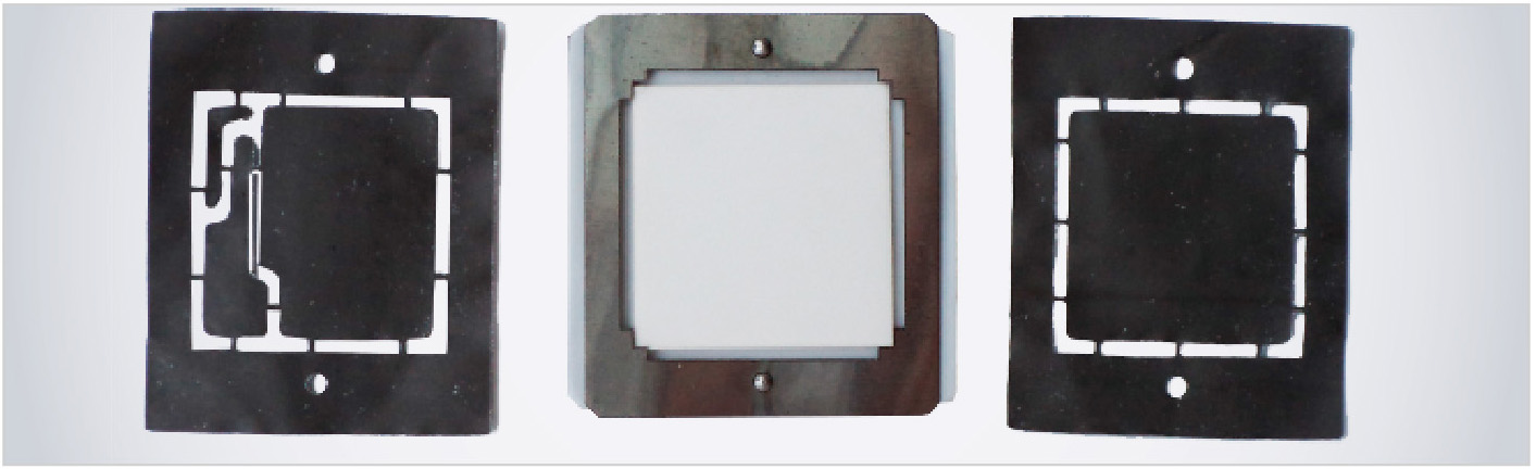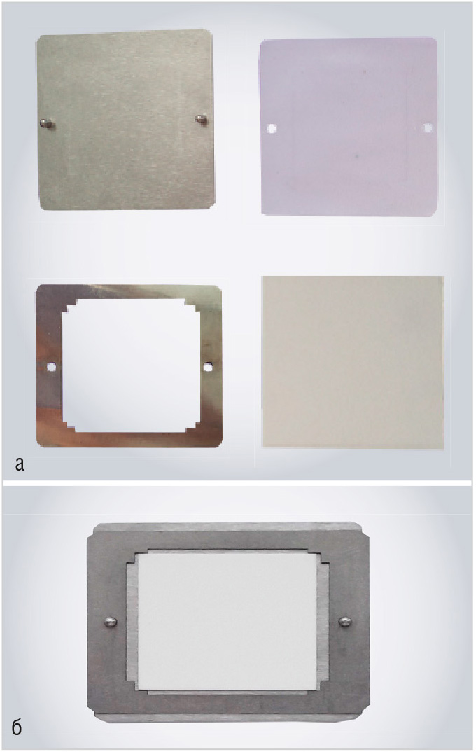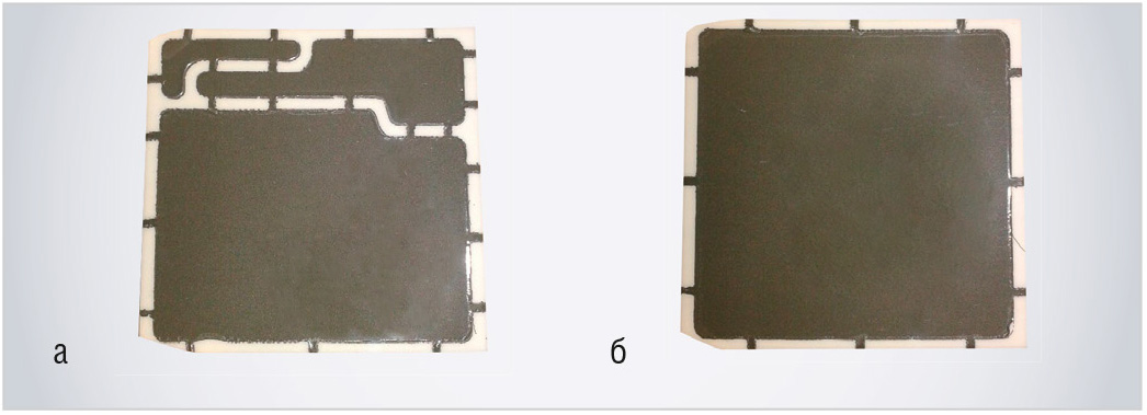 Сначала путём совмещения отверстий с выступающими штифтами оправки накладывалась заготовка из фторопластовой (майларовой или полиимидной) плёнки с металлизационным слоем, расположенным сверху. Затем устанавливался трафарет и закреплялась подложка. На подложку с помощью совмещения отверстий с выступающими штифтами оправки помещалась вторая заготовка с верхним топологическим рисунком плёнки с металлизационным слоем, расположенным снизу. Далее сверху накладывался силиконовый коврик, нагретый до температуры +150±20°С, поверх которого укладывалась вторая полиуретановая пластина. Затем осуществлялся прижим стальной плиты установки УМП-1 к верхней полиуретановой пластине с усилием 0,6 МПа и выдержкой в течение 20 с. Оправка вынималась из-под плиты установки, после чего фторопластовая (майларовая, полиимидная) плёнка удалялась с подложки. При этом на керамической подложке оставался отпечаток перенесённого топологического рисунка, который после сушки при температуре 160°С в течение 90 мин вжигался. Наилучший перенос рисунка получался с плёнки ПЭТ (лавсан, майлар), наихудший – с использованием полиимидной плёнки. Вжигание металлизационного рисунка осуществлялось в среде влажного формиргаза при температуре +1320±20°С, время нахождения деталей в зоне с максимальной температурой в печи ЦЭП-214 составляло 30 мин, в результате чего достигалось сцепление металлизационного покрытия с керамикой. После термической обработки подложек качество сцепления металлизационного покрытия, составляющего топологический рисунок, оценивалось с помощью алмазной иглы.