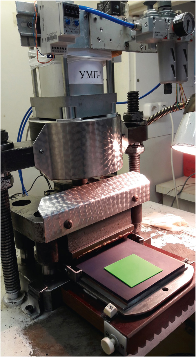 На установке теплового переноса УМП-1 (см. рис. 9) располагалась полиуретановая пластина, на которую устанавливалась оправка для теплового переноса (см. рис. 10, 11).