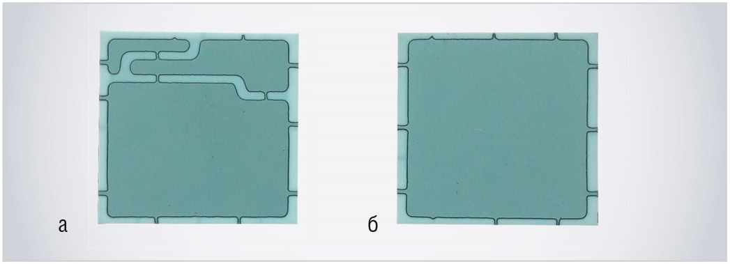 Опытные образцы подложек для силовых модулей с металлизационными рисунками, полученными бестрафаретным методом с последующим осаждением методом ХГН толстого слоя меди (200–300 мкм), выдержали воздействие 100 термоциклов в режиме -60 ...+150°С.