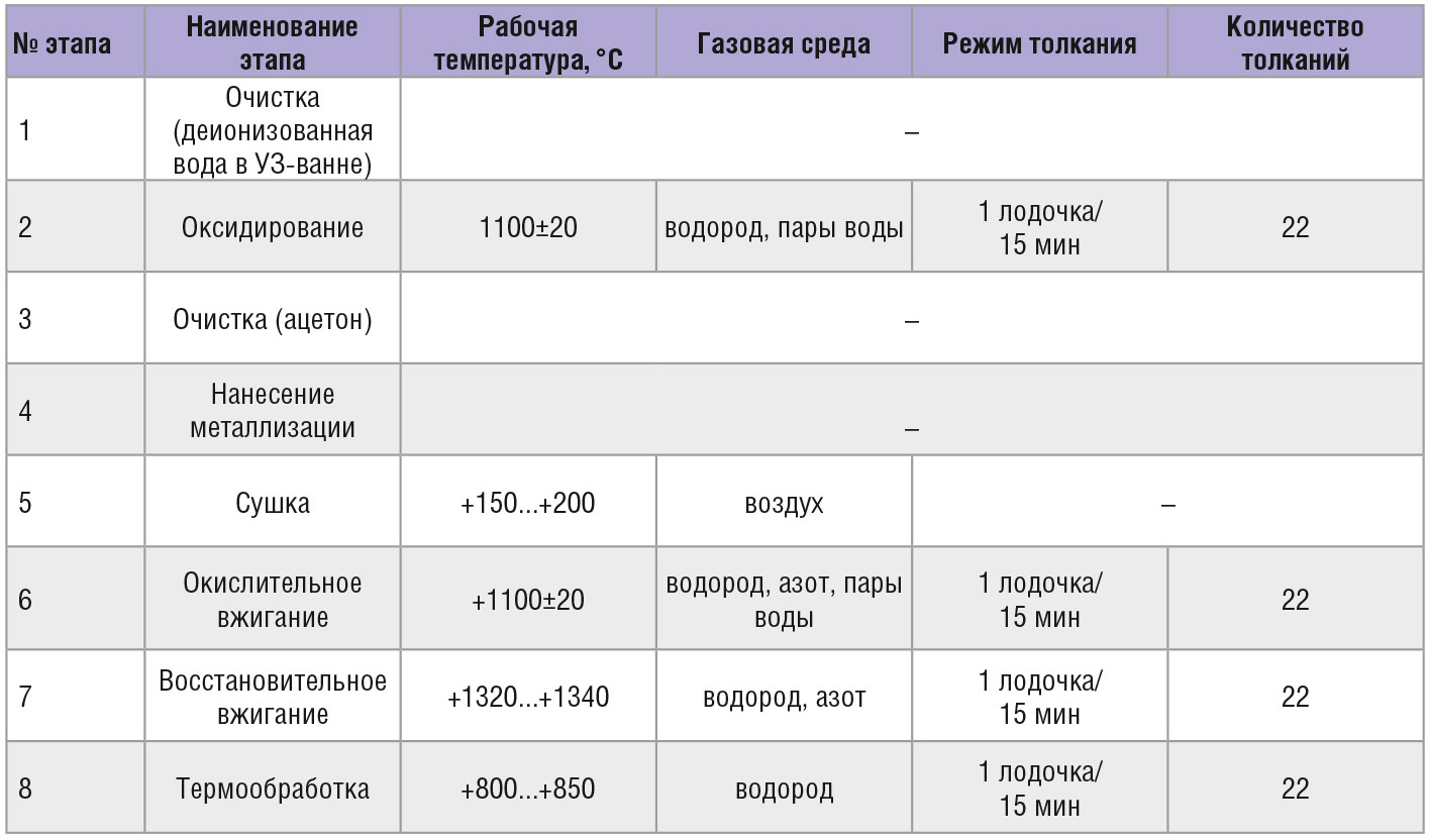 Вжигание перенесённого металлизационного рисунка осуществлялось в печи ЦЭП-214 в 2 стадии: сначала в окислительной атмосфере при температуре +1100±20°С, а затем в восстановительной атмосфере (в среде влажного формиргаза) при температуре +1320±20°С.