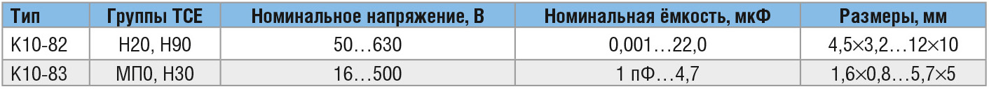 Решение важнейшей задачи по улучшению массогабаритных характеристик самых массовых, низковольтных многослойных керамических конденсаторов, в том числе за счёт снижения номинальных напряжений и толщины диэлектрика, потребовало совершенствования рецептуры и технологии производства используемых керамических материалов. В результате проведения ряда материаловедческих работ разработаны перспективные материалы наиболее востребованных групп температурной стабильности ёмкости (ТСЕ) с практически предельными для каждой группы значениями диэлектрической проницаемости. Введённое в эксплуатацию в 2015 году технологическое оборудование фирмы КЕКО (Словения) позволило не только значительно сократить сроки выполнения производственных заказов, но и открыло дополнительные возможности дальнейшего совершенствования технологии для улучшения массогабаритных характеристик конденсаторов. В результате проведённых в последние годы ОКР разработаны и освоены в производстве новые многослойные керамические чип-конденсаторы, основные параметры которых приведены в таблице 1.
