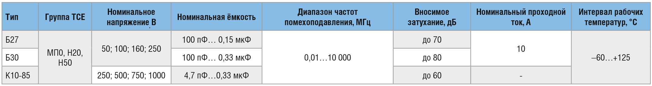 Кроме того, на предприятии освоено производство помехоподавляющего шайбового конденсатора К10-81, используемого в качестве ёмкостного элемента фильтров Б25 и Б26 или как самостоятельное изделие. Однако приведённая номенклатура помехоподавляющих изделий в свете современных требований к импортозамещению ЭКБ уже не обладает функциональной полнотой в части малогабаритных и миниатюрных фильтров. В порядке подготовки к формированию функционально полной номенклатуры помехоподавляющих фильтров категории качества ВП НИИ «Гириконд» разработаны и освоены в производстве с приёмкой ОТК фильтры Б27 и Б30 (см. рис. 3), а также опорные помехоподавляющие керамические конденсаторы К10-85 (см. табл. 4).