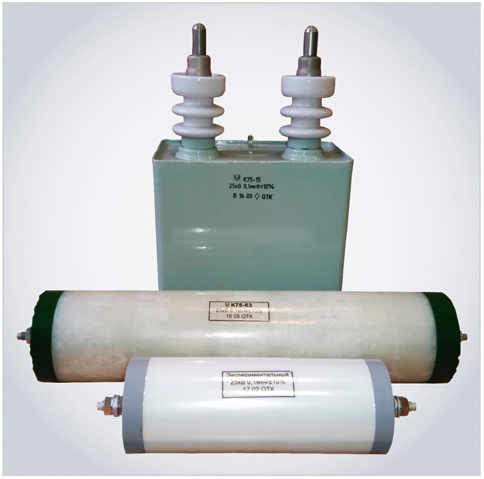 На основе металлизированной ПП-плёнки также реализовано новое базовое конструктивно-технологическое решение для высоковольтных конденсаторов. В 2018 году на его основе разработаны высоковольтные конденсаторы общего назначения К78-51 (см. табл. 9) категории качества ОТК c номинальным напряжением до 40 кВ и удельной запасаемой энергией до 200 Дж/дм3. Это значение в несколько раз превышает уровень удельных характеристик существующих высоковольтных конденсаторов на основе комбинированного бумажно-плёночного диэлектрика. На рисунке 6 представлен конденсатор К78-51 на фоне серийно выпускаемых высоковольтных конденсаторов той же ёмкости и того же номинального напряжения с комбинированным диэлектриком.