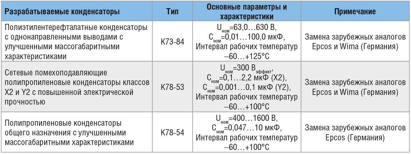 Приведённые выше положения определили направления научно-технической деятельности НИИ «Гириконд» в области конденсаторов с органическим диэлектриком. В таблице 8 представлены краткие характеристики новых низковольтных конденсаторов, окончание разработок и наладка производства которых планируется в 2018 году.