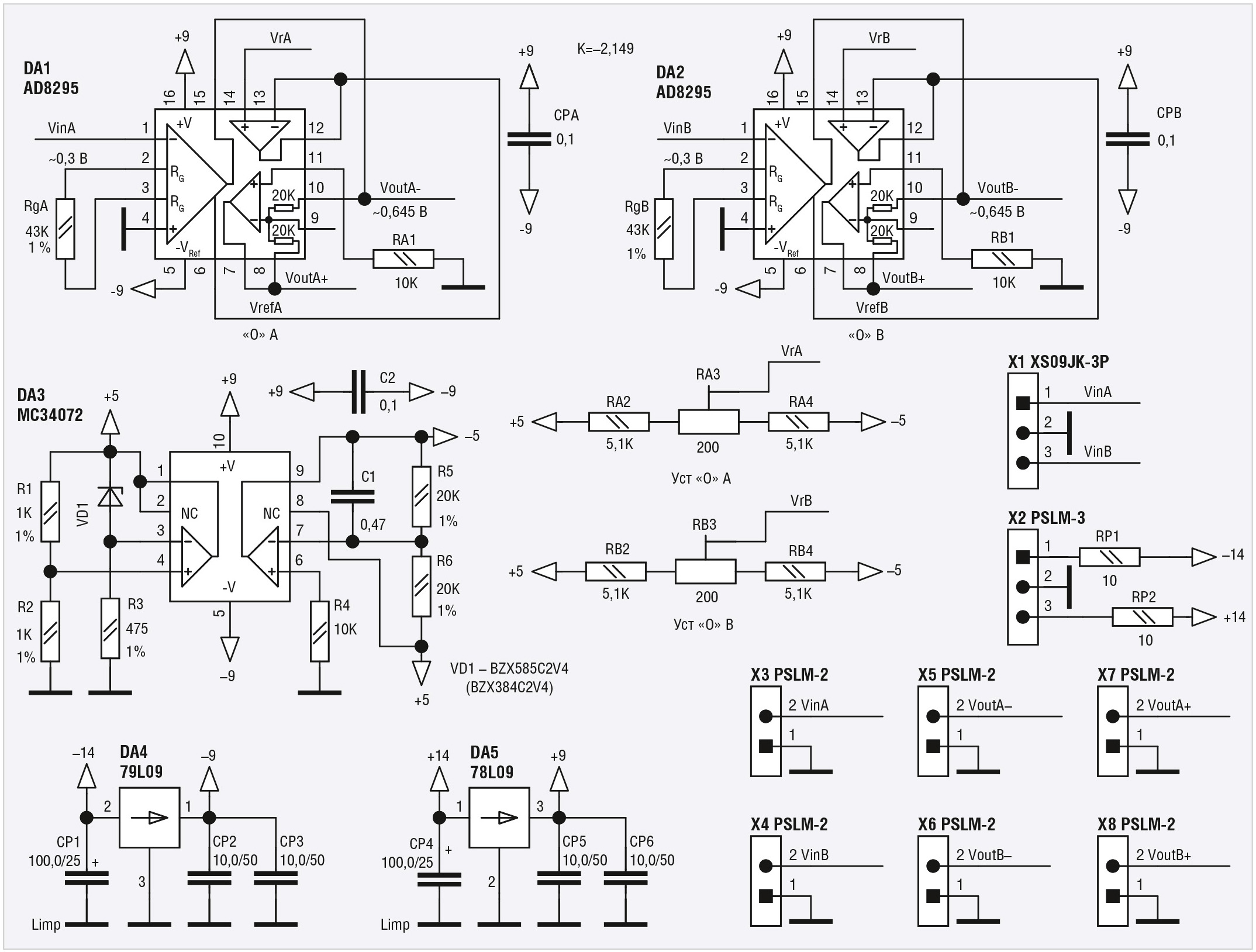 В схеме на рисунке 1 в качестве упомянутых повторителей используются встроенные в DA1 и DA2 ОУ (13-й и 14-й выводы – инвертирующий и неинвертирующий входы, 12-й вывод – выход), на неинвертирующие входы которых поданы опорные напряжения VrA и VrB (для каналов A и B соответственно). Опорные напряжения снимаются с движков подстроечных резисторов RA3 и RB3. Эти резисторы, в свою очередь, подключены к опорным напряжениям +5 В и –5 В через резисторы RA2, RA4 и RB2, RB4, соответственно.