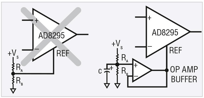Это было сделано по двум причинам. Во-первых, как следует из справочного листка на микросхему ИУ AD8295 (DA1, DA2), подача опорного напряжения на её вход REF (6-й вывод) должна осуществляться через повторитель на ОУ (см. рис. 2 справа), а не напрямую с потенциометра (см. рис. 2 слева).