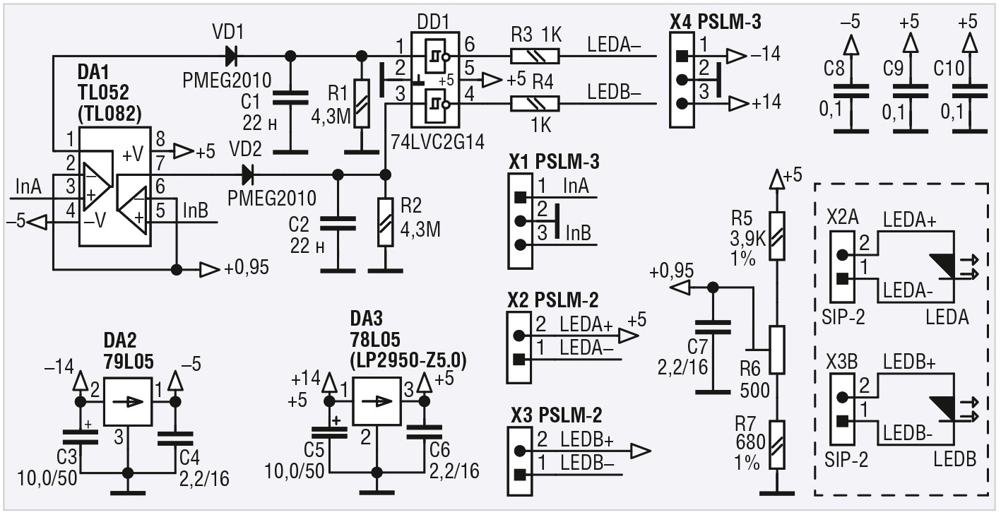 Для того чтобы объяснить отличие работы усовершенствованного пик-детектора от описанного в [1], напомним принцип его работы. На инвертирующие входы двух компараторов, сконструированных на базе двух стандартных ОУ, подаются два пороговых опорных напряжения: положительное (+0,85 В) и отрицательное (–0,85 В). На неинвертирующие входы этих же компараторов подаётся входной сигнал, снятый с предварительного усилителя, который затем усиливается в 10 раз (до 8,5 В) мощным ОУ (или удвоенный до 17 В при его работе в мостовом режиме). Выходной сигнал обоих компараторов через диоды подаётся далее на вход триггера Шмидта, который за счёт гистерезиса устраняет ложные срабатывания компараторов при нахождении уровня сигнала в районе порога (+0,85 В или –0,85 В). Выходным сигналом триггера Шмидта зажигаются светодиоды. В результате, если уровень сигнала какого-либо канала (А или B) выше порога +0,85 В или ниже порога –0,85 В, то зажигается соответствующий светодиод. Эта схема показала хорошую работу, однако и здесь представилась возможность для усовершенствования.