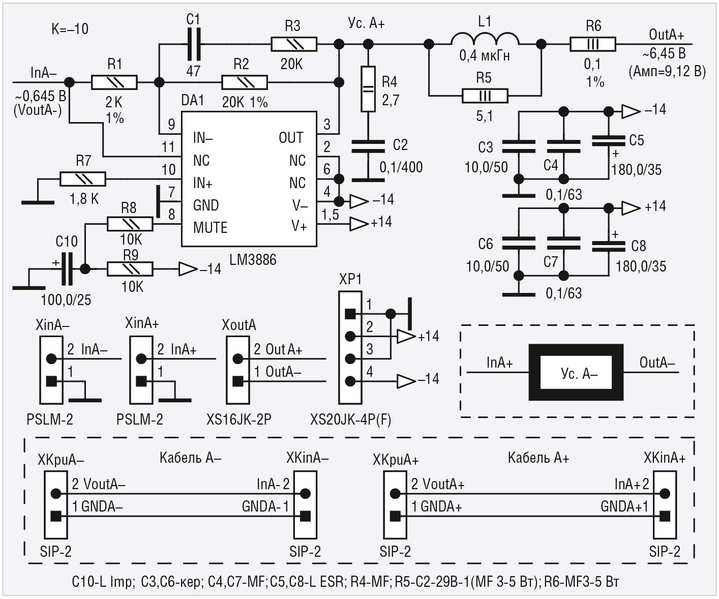 Кроме того, в параллельном или мостовом включении для компенсации несколько отличающихся выходных сопротивлений двух экземпляров микросхем LM3886 рекомендуется дополнительная установка последовательно с нагрузкой (АС) компенсационного резистора RК номиналом 0,1 Ом.
