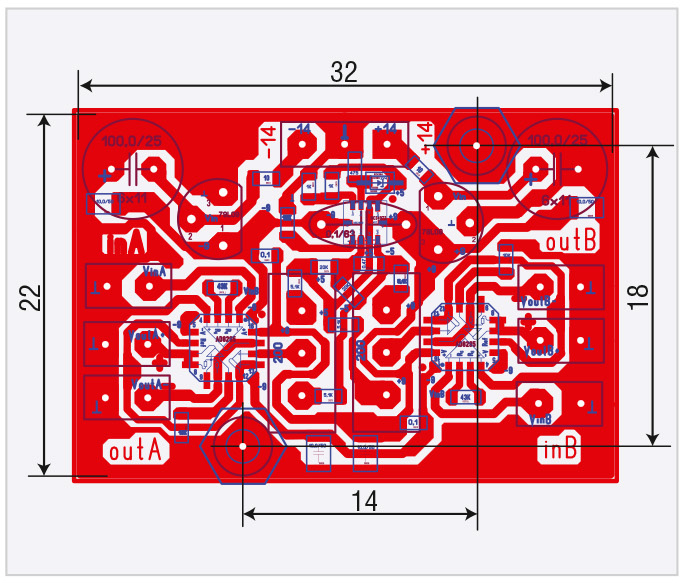 Следует добавить, что сдвоенный ОУ DA3 в настоящее время выпускается в сверхминиатюрном корпусе WQFN10 размером 2,6×2,6 мм (MC34072AMTTBG). Этот недорогой ОУ выпускается уже довольно давно (правда, в более габаритных корпусах), он достаточно надёжный, имеет максимальное напряжение питания до 44 В и показал отличную работу в двуполярном стабилизаторе на мощных полевых транзисторах [2]. Его использование в предварительном усилителе не только не привело к увеличению площади платы, а наоборот, при усовершенствованной разводке (см. далее) площадь платы даже немного уменьшилась с 30 мм × 25 мм = 750 мм2 в [1] до 32 мм × 22 мм = 704 мм2.