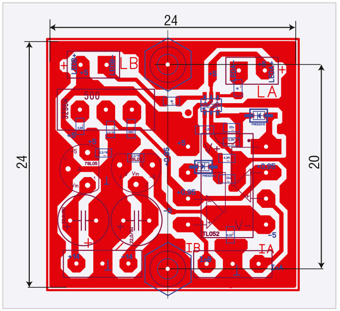 Такой земляной контур представляет собой второй слой меди, который электрически соединён с земляным контуром, расположенным на стороне дорожек, с помощью выводов компонентов навесного монтажа (электролитических конденсаторов, штыревых разъёмов, микросхем стабилизаторов в корпусе ТО-92), которые пропаиваются с двух сторон. Выводы навесных компонентов, непосредственно не контактирующих с земляным контуром, окружены «прогалинами», размер которых несколько больше соответствующих контактных площадок, расположенных на слое дорожек. Технология изготовления подобных двусторонних печатных плат подробно описана в статье [7], где в качестве примера приведены фотографии обеих сторон платы предварительного усилителя. Второй земляной контур не является обязательным, но в плате предварительного усилителя его желательно реализовать.