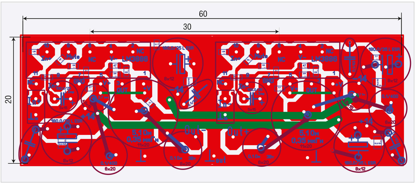 Отличительная особенность разводки всех плат – полное отсутствие резисторов с нулевым сопротивлением (перемычек). На плате усилителя мощности скомпонованы сразу два усилителя на базе ОУ LM3886, включённых в мостовом режиме работы. Таким образом, вместо четырёх отдельных плат [1] в усовершенствованном варианте используются всего две платы (для каналов A и B). Это существенно снизило трудоёмкость подсоединения плат к ИП и выходным разъёмам, предназначенным для подключения к АС. На плате усилителя мощности (см. рис. 7) зелёным цветом показаны проводники, которые требуется распаять с обратной стороны платы. В качестве таких проводников следует использовать провод сечением не менее 1…1,5 мм2, например, МГТФ-1,5. Размер каждой из двух плат составляет 20×60 мм.