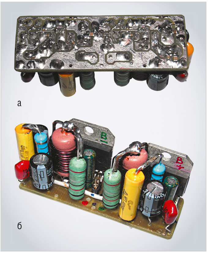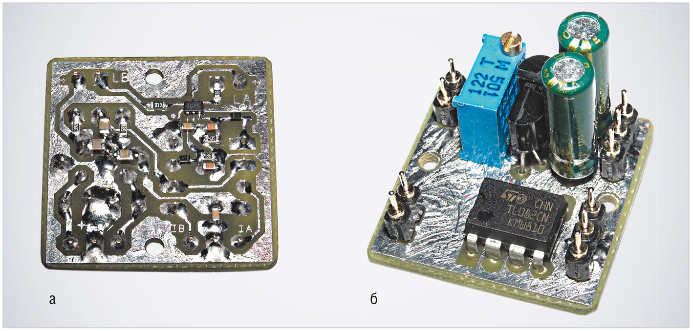 После того как платы изготовлены, их необходимо покрыть 2–3 слоями цапонлака или любого другого нитролака со стороны дорожек. На рисунках 8–10 приведены фотографии всех плат до покрытия лаком, поэтому платы предварительного усилителя и пик-детектора показаны без крепёжных стоек, а плата усилителя мощности – без припаянных к ней проводов питания и выходных сигналов.