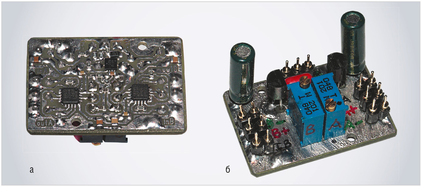 А как обстоит дело, если сигнал не синусоидальный, а звуковой? К счастью, такой сигнал так же, как и синусоидальный, практически симметричен относительно оси времени (если не принимать во внимание небольшой сдвиг фаз). Это означает, что устройство с двумя компараторами и с одним компаратором (на канал) должны работать идентично. Эксперимент, проведённый автором с двумя устройствами, это подтвердил. За счёт упрощения схемы размер платы существенно уменьшен с 30×26 мм до 24×24 мм.