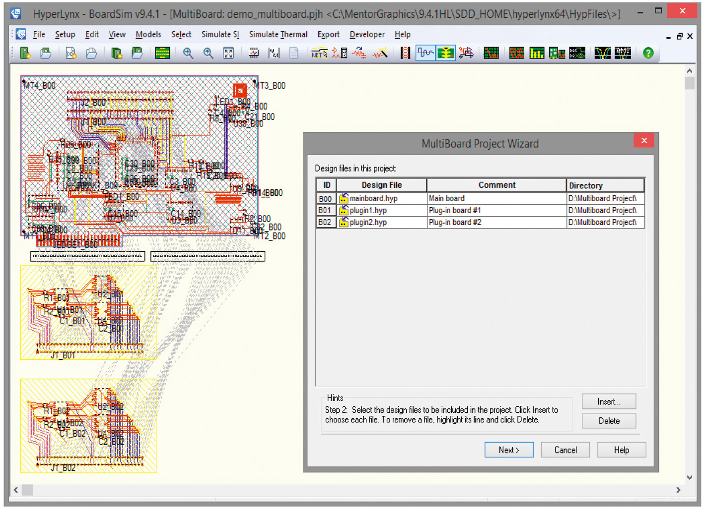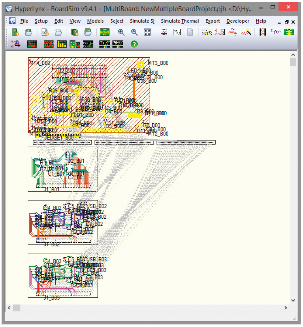 Может случиться так, что разрабатываемое устройство предполагает использование нескольких плат расширения и обмен информацией между ними. Средства современных редакторов проектирования топологии печатных плат (PADS Layout, Xpedition Layout, Altium Designer) позволяют передать в программу HyperLynx для проведения дальнейшего анализа данные об электрических параметрах компонентов и топологии ПП, входящих в многоплатную систему. К этому моменту проектирование всех плат в топологическом редакторе должно быть полностью завершено. Каждый проект ПП, являющейся конструктивной частью многоплатной системы, должен быть сохранён в формате .hyp.