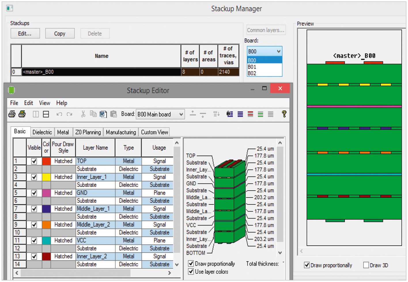 Инструменты проверки и редактирования стеков слоёв плат многоплатной системы в MultiBoard предоставляет Stackup Manager (см. рис. 2). В таблице в его левой части отображено имя выбранной в списке Board платы многоплатной системы, в правой части – 2D- или 3D-модель её стека слоёв. Stackup Manager служит интерфейсом для запуска редактора Stackup Editor, который в режиме MultiBoard вызывают для каждой отдельной платы и используют для добавления и удаления слоёв, изменения порядка сигнальных слоёв, назначения слоям цвета, толщины и других свойств, изменения свойств диэлектрика и проводимости металла.