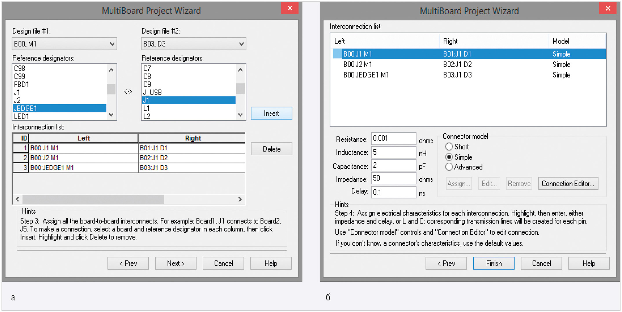 После того как все необходимые файлы плат добавлены в проект, следует нажать кнопку Next > для перехода к третьему шагу работы мастера (см. рис. 4а), на котором выполняют определение соединений (виртуальных разъёмов) плат. При этом в качестве точек соединения можно использовать любые компоненты платы. Рассмотрим данное окно мастера более подробно. Оно разделено на две части. В полях Design file #1 и Design file #2 из выпадающего списка выбираются названия плат, между которыми требуется выполнить соединение. В полях Reference designators отображены позиционные обозначения компонентов выбранных плат, которые могут быть использованы в качестве соединителей. Чтобы настроить соединение между двумя платами проекта, необходимо выбрать в этих полях нужные значения и нажать кнопку Insert, в результате чего пара плат появится в списке соединений Interconnection list. Для удаления ошибочно добавленных значений в Interconnection list необходимо в этом списке выделить левой кнопкой мыши нужную строку и нажать кнопку Delete. Можно также выполнить соединение определённых выводов разъёмов между собой. После того как все пары соединений назначены, необходимо при помощи кнопки Next > перейти к четвёртому шагу работы мастера.