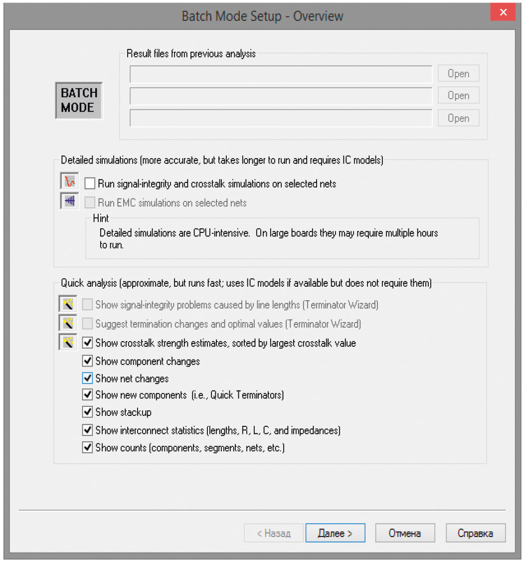 Batch Mode Wizard в MultiBoard используют для обнаружения цепей, имеющих риски наличия проблем целостности сигналов, а также для получения общей информации о всех цепях проекта многоплатной системы в виде текстового отчёта. Запуск анализа производится командой основного меню Simulate SI/Run Generic Batch Simulation или посредством нажатия на одноимённую пиктограмму верхней панели инструментов, в результате чего будет открыто окно Batch Mode Setup – Overview (см. рис. 6).