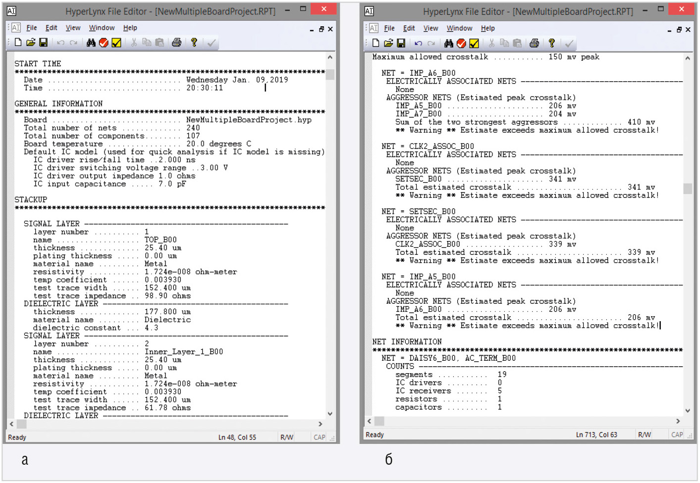 В файле выводится общая информация о многоплатном проекте: общее количество цепей (Total number of nets), общее число компонентов (Total number of components), температура платы (Board temperature), характеристики интегральных схем (Default IC model) и информация о стеке слоёв печатных плат многоплатной системы (STACKUP), отчёт о помехах (CROSSTALK REPORT), данные о выбранных для анализа цепях (NET INFORMATION): число сегментов, приёмников и передатчиков, резисторов и конденсаторов для каждой цепи.