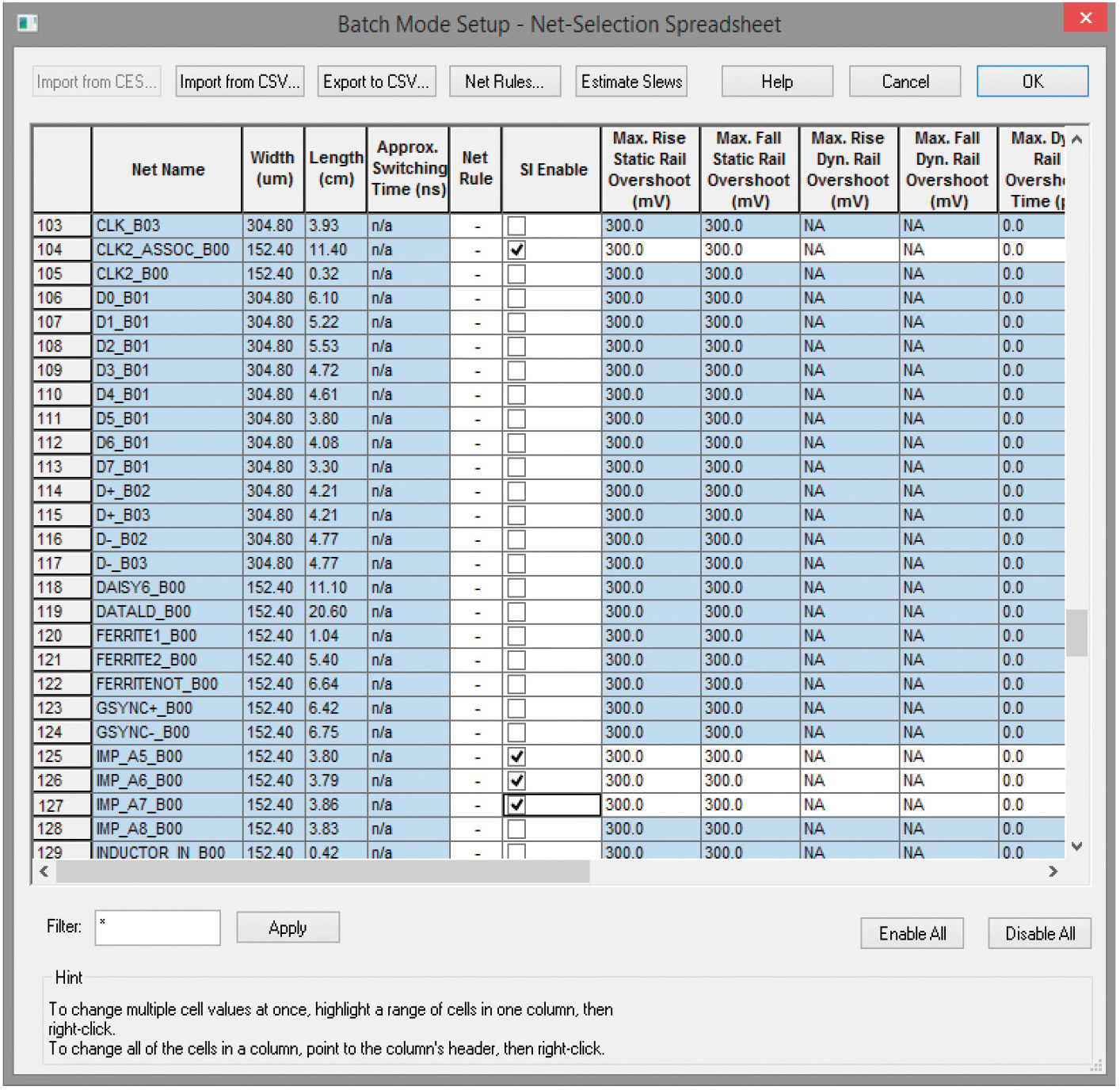 Выполним детальное моделирование целостности сигналов и перекрёстных помех этих цепей, для чего снова откроем окно Batch Mode Setup – Overview и в поле Detailed simulations установим флажок Run signal-integrity and crosstalk simulations on selected nets (все остальные флажки в этом случае должны быть сняты) и нажмём кнопку «Далее >» – в результате будет открыт ряд диалоговых окон, где разработчик определяет настройки анализа. Выбор цепей для анализа выполняют установкой/снятием флажков в поле SI Enable окна Batch Mode Setup – Net-Selection Spreadsheet (см. рис. 8), которое открывают кнопкой SI Nets Spreadsheet из окна мастера Batch Mode Setup – Select Nets and Constraints for Signal-Integrity Simulation.