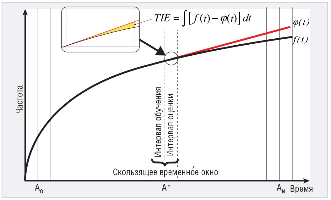 Как видно, только из-за эффекта старения кварцевые генераторы сами по себе не могут обеспечить столь строгие требования по временно́й ошибке. Однако для её уменьшения можно использовать компенсацию ухода частоты генератора во времени. Суть подобной компенсации сводится к тому, чтобы по известному ранее поведению частоты генератора предсказать изменение частоты на следующий период. Первый период времени, за который происходит оценка старения генератора, называется периодом обучения, второй период – период определения временно́й ошибки. Процесс обучения представляет собой построение аппроксимирующей модели дрейфа частоты, которая позволит предсказать дрейф частоты генератора в последующий период времени. В итоге временнáя ошибка будет определяться уже разницей между прогнозируемым и реальным старением (см. рис. 1) [3].