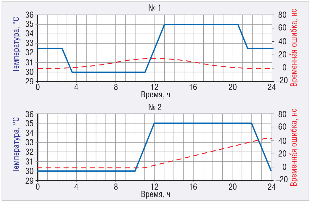 Профиль 1 (вверху) абсолютно симметричен в течение суток – максимум временно́й ошибки при таком профиле составляет примерно 15 нс, при этом через 24 часа она равна 0. Профиль 2 (внизу) не симметричен – максимум временно́й ошибки составляет около 45 нс.