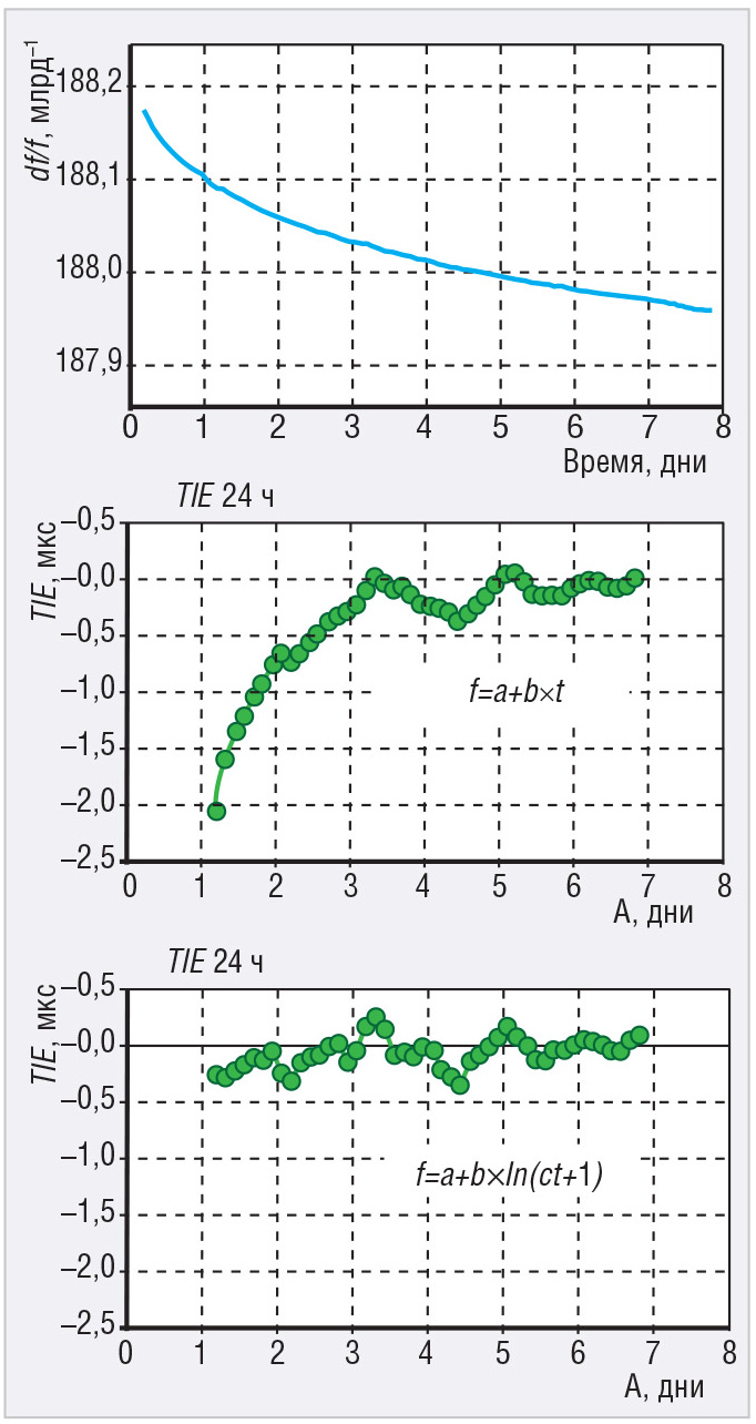 В качестве аппроксимирующей модели можно использовать линейную функцию. Однако при этом следует иметь в виду, что в первые дни после длительного выключения ошибка прогнозирования линейной аппроксимацией будет чрезмерно высокой. На рисунке 1 представлена типовая характеристика старения КГ, после длительного выключения. Использование такой компенсации позволяет уменьшить временнýю ошибку, вносимую старением КГ, в 3–5 раз. Таким образом, временнáя ошибка при использовании подобной компенсации может составлять менее 400 нс за 24 часа, что удовлетворяет требованиям стандарта 5G.