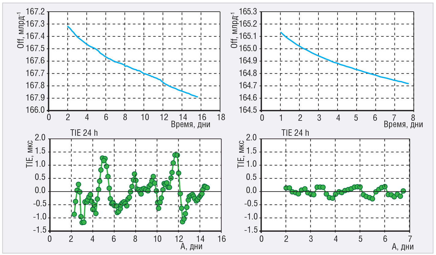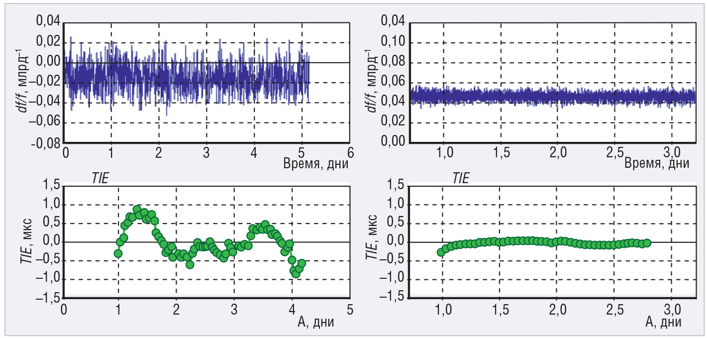 При измерениях столь малых величин временно́й ошибки крайне важно учесть все возможные факторы, которые могут внести дополнительную погрешность. Так, например, для таких измерений в качестве опорного сигнала использовался сигнал от водородного стандарта частоты. На рисунке 5 показано изменение частоты с течением времени одного и того же кварцевого генератора при использовании рубидиевого (слева) и водородного (справа) стандарта и полученные графики временно́й ошибки.