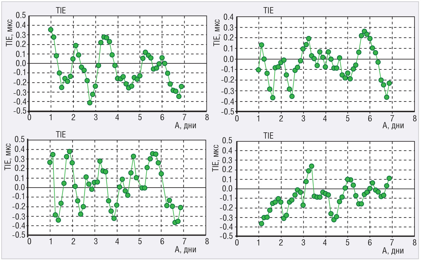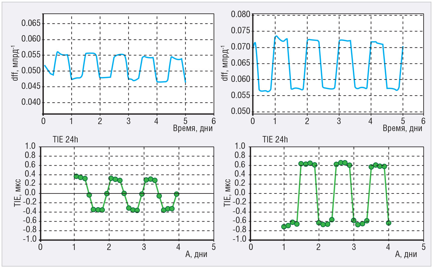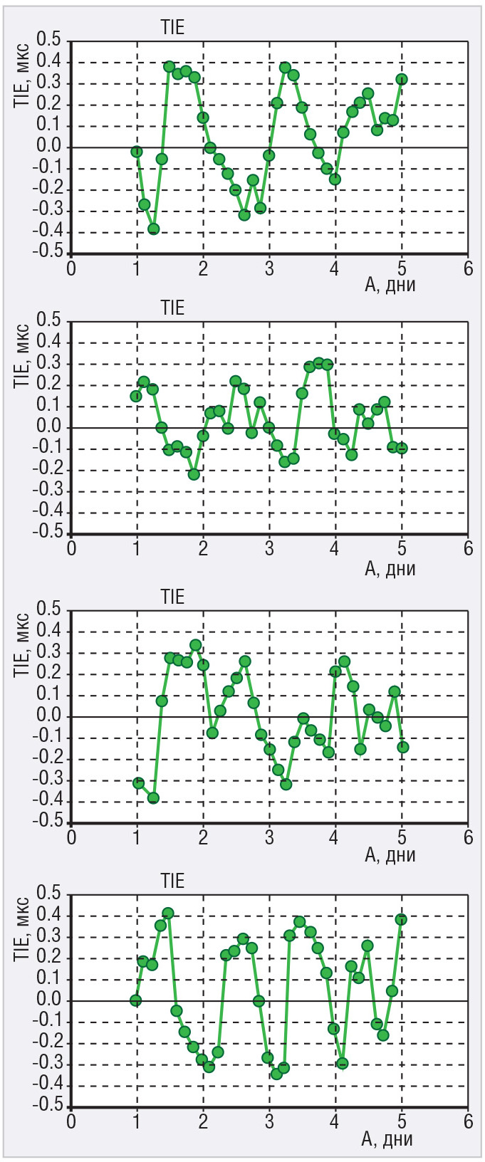 На рисунке 8 представлены результаты оценки временно́й ошибки за 24 ч для прецизионных кварцевых генераторов ГК360 при изменении температуры окружающей среды в пределах 5°С в течение суток (по профилю 2, показанному на рисунке 2).