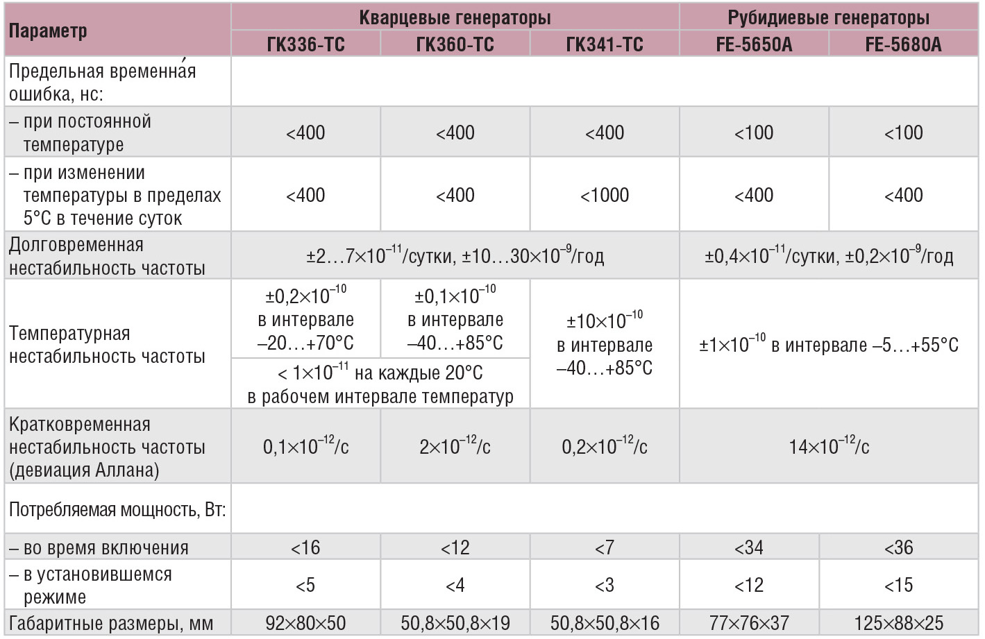 В таблице приведены основные параметры и предельная временнáя ошибка, которую могут обеспечить эти генераторы в разных режимах работы. Указанная для кварцевых генераторов временнáя ошибка подразумевает использование компенсации ухода частоты во времени, при этом сами генераторы обязательно проходят отбор по прогнозируемости дрейфа частоты. Рубидиевые генераторы, в свою очередь, отбираются по температурной стабильности частоты.