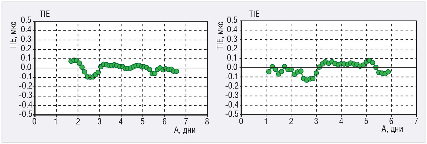 На рисунке 11 показаны результаты измерений временно́й ошибки для этих же рубидиевых генераторов при изменении температуры в пределах 5°С в течение суток (по профилю 2, приведённому на рисунке 2).