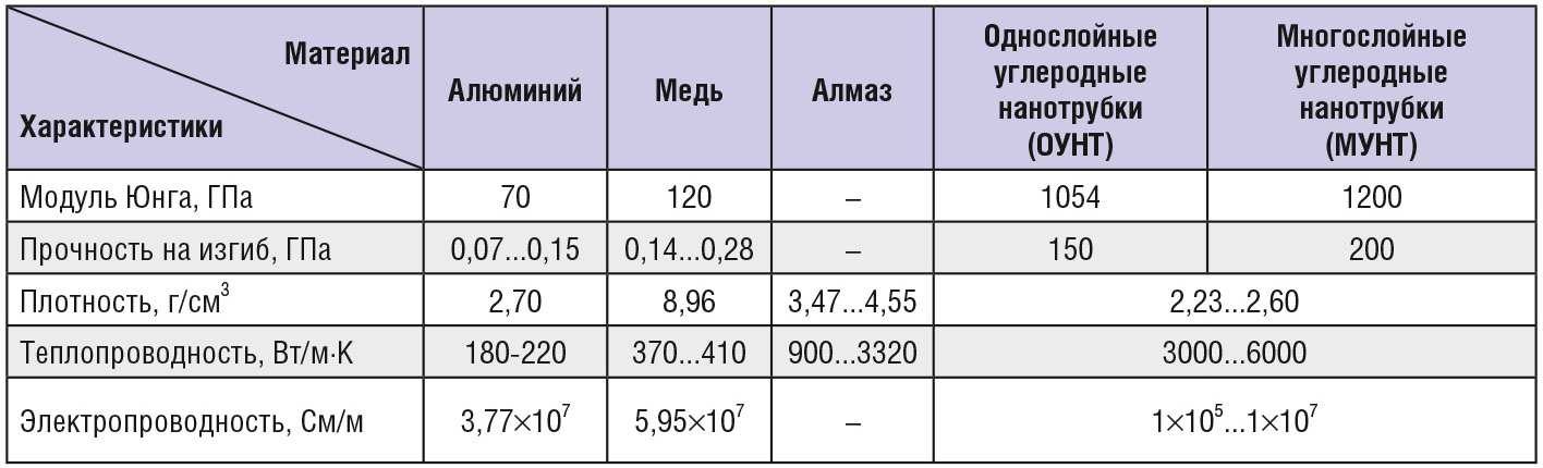 Разновидностью графита являются углеродные нанотрубки, которые представляют собой протяжённые структуры, состоящие из свернутых в однослойную (ОСНТ) или многослойную (МСНТ) трубку графитовых слоев. Наименьший диаметр нанотрубки – 0,714 нм, что соответствует диаметру молекулы фуллерена С60. Расстояние между слоями практически всегда составляет 0,34 нм, что соответствует расстоянию между слоями в графите. Длина таких образований достигает десятков микрон и на несколько порядков превышает их диаметр. Основные свойства нанотрубок: малые размеры, электропроводность, механическая прочность, химическая стабильность и очень высокая теплопроводность, достигающая 6000 Вт/м·К, в то время как теплопроводность чистого алмаза составляет 3320 Вт/м·К (см. табл.).