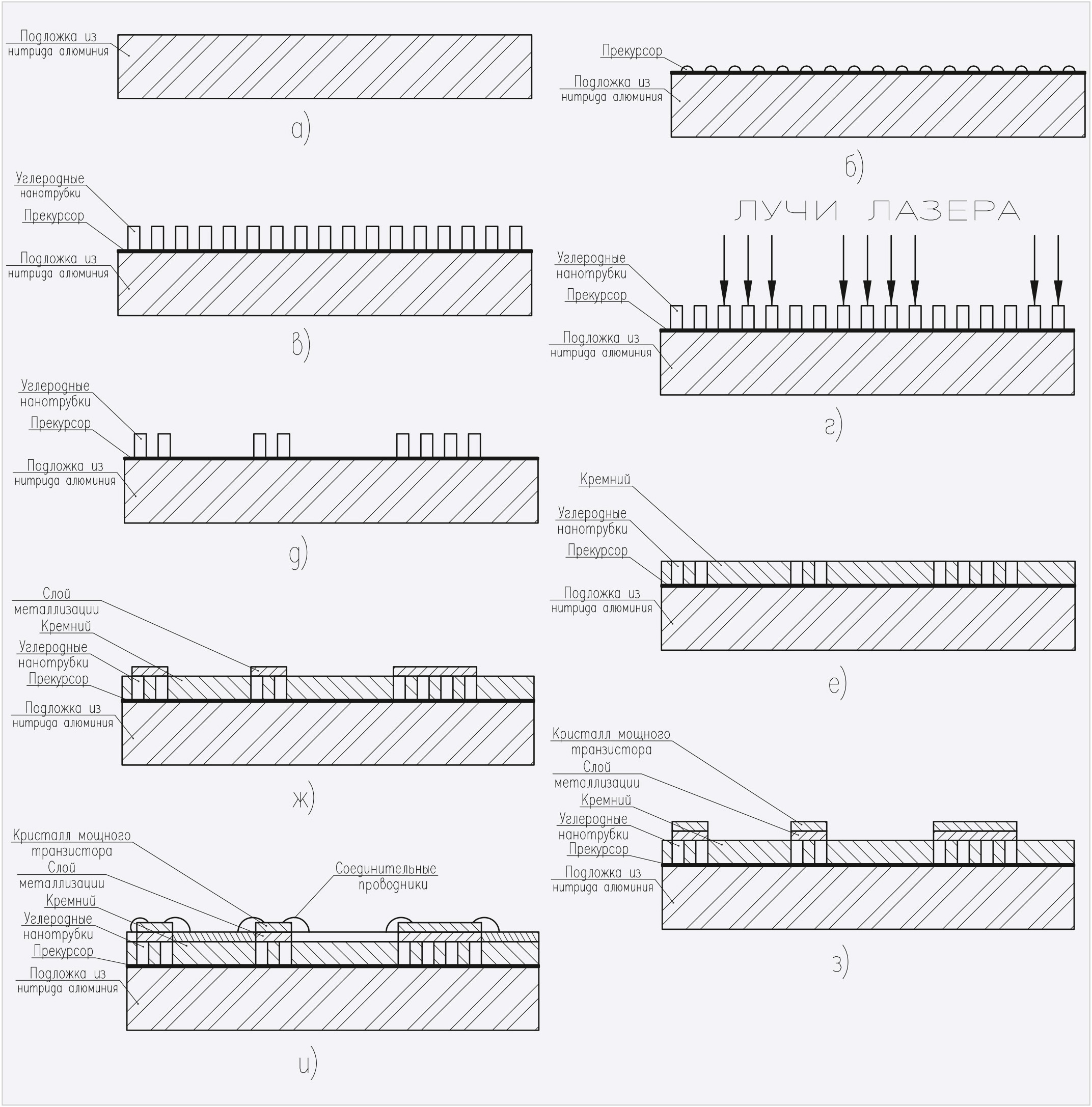 Конструкция гибридной интегральной схемы состоит из отшлифованной пластины из керамики на основе нитрида алюминия (а), на которую нанесён слой прекурсора (б) со сформировавшимися каталическими центрами, из которых выращен массив УНТ (в) (см. рис. 1). После обработки алюмонитридной пластины с нанесённым массивом УНТ лазерным излучением (г) по специальной программе с целью получения пробельных мест топологического рисунка схемы, часть массива УНТ (д) удалена за счёт сгорания на воздухе УНТ при воздействии на них луча лазера. В процессе пропитки расплавленным кремнием внутренние полости оставшихся УНТ и участки с удалёнными из массива УНТ (пробельные места) заполняются кремнием (е). После пропитки расплавленным кремнием на участки с не удалёнными УНТ из массива для получения топологического рисунка схемы нанесён слой металлизации (ж). После травления слоя металлизации и получения топологического рисунка, на участки алюмонитридной пластины с УНТ, пропитанными кремнием и с нанесённым слоем металлизации, установлены кристаллы мощных транзисторов (з). Затем методом ультразвуковой сварки контактные площадки кристаллов мощных транзисторов соединялись алюминиевой проволокой с тонкоплёночными пассивными элементами гибридной интегральной схемы (и).