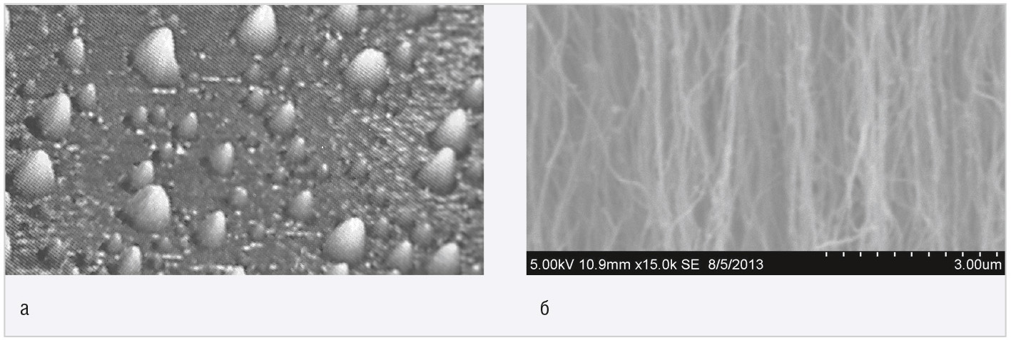 Скорость подачи прекурсора в реактор составляла 0,1 мл/мин. В ходе работы были уточнены следующие параметры: температура синтеза – +800°С; скорость потока газа носителя – 200 мл/мин, время синтеза – 1 ч. После проведения часового CVD-синтеза высота массива УНТ составляла порядка 500 мкм. УНТ в полученном массиве равномерно распределены по поверхности алюмонитридной пластины, что подтверждает одинаковую скорость роста УНТ на всей её поверхности. Полученный массив УНТ (см. рис. 2) состоял из многослойных УНТ (плотность трубок в массиве со средним диаметром 30–60 нм, выборка и подсчёт диаметра проводятся более чем по 10 микрофотографиям, включающим более 100 нанотрубок) и расстояний между ними в виде образовавшихся пор размером 3–5 нм.