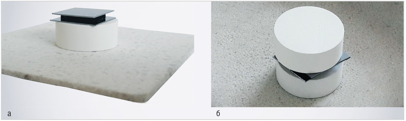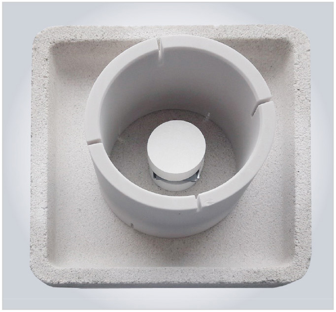 После лазерной обработки для пропитки жидким кремнием (силицирования) участков из вертикально ориентированных УНТ сверху и снизу диска из алюмонитридной керамики устанавливали пластины из монокристаллического кремния марки КЭФ, а всю эту сборку помещали на шайбу из гексагонального нитрида бора (см. рис. 3), которую прижимали грузом из такой же шайбы.