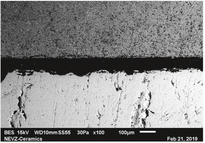 Как видно на микрофотографии, массив УНТ (средний слой чёрного цвета) расположен между пластиной из нитрида алюминия (верхний слой) и пластиной кремния (нижний светлый слой). В микроструктуре массива УНТ (см. рис. 9), пропитанного кремнием, на границе с нитридом алюминия наблюдаются отдельные белые вкрапления кремния и многочисленные микропоры, расположенные между нанотрубками.