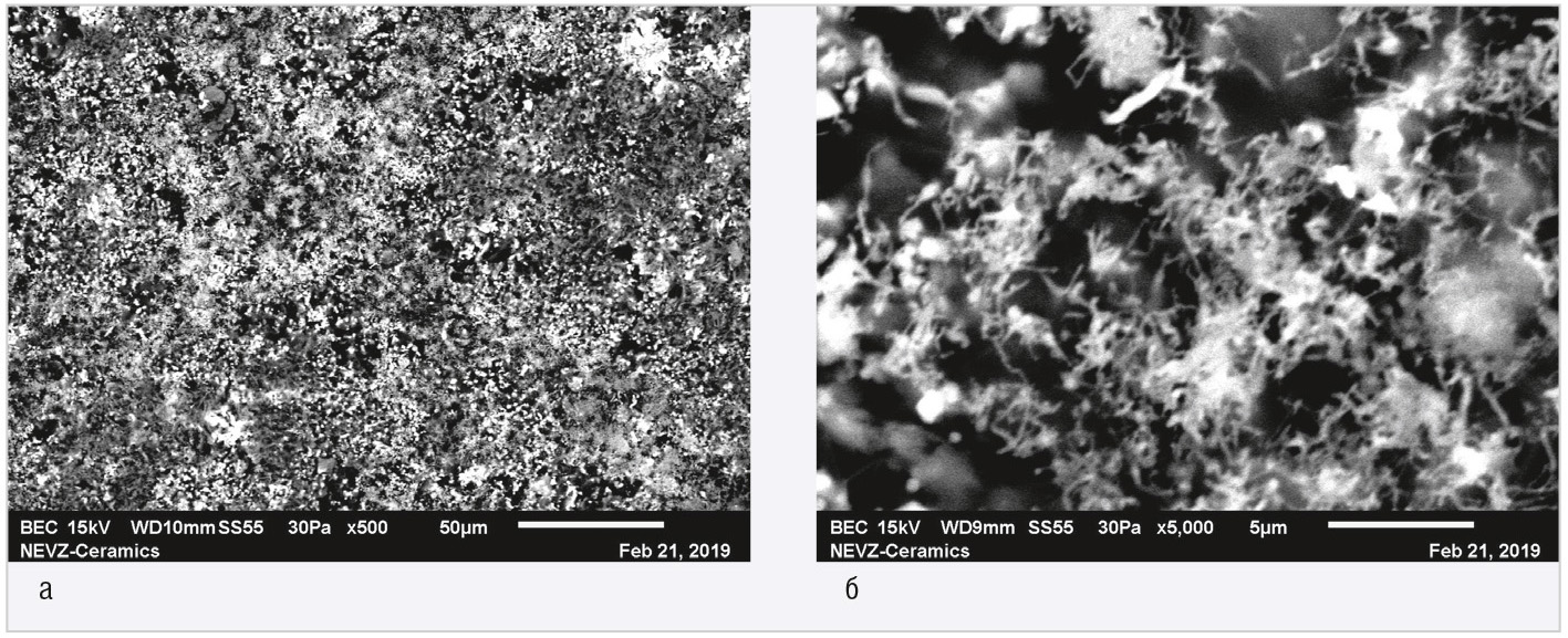 В ходе пропитки протекала реакция силицирования, в результате чего поверхность вертикально ориентированных УНТ насыщалась кремнием с формированием кремнийсодержащей фазы – SiC, количественное соотношение которой к кремнию определялось продолжительностью термической обработки. В результате взаимодействия жидкого кремния с углеродом УНТ на их поверхностях образовывался карбид кремния, при этом на пробельных местах оставался кремний. Наибольшей адгезией обладал слой с пропитанными кремнием УНТ, синтез которых осуществлялся на шлифованных подложках из нитрида алюминия, и в качестве прекурсора использовался 10%-й раствор ферроцена в толуоле.
