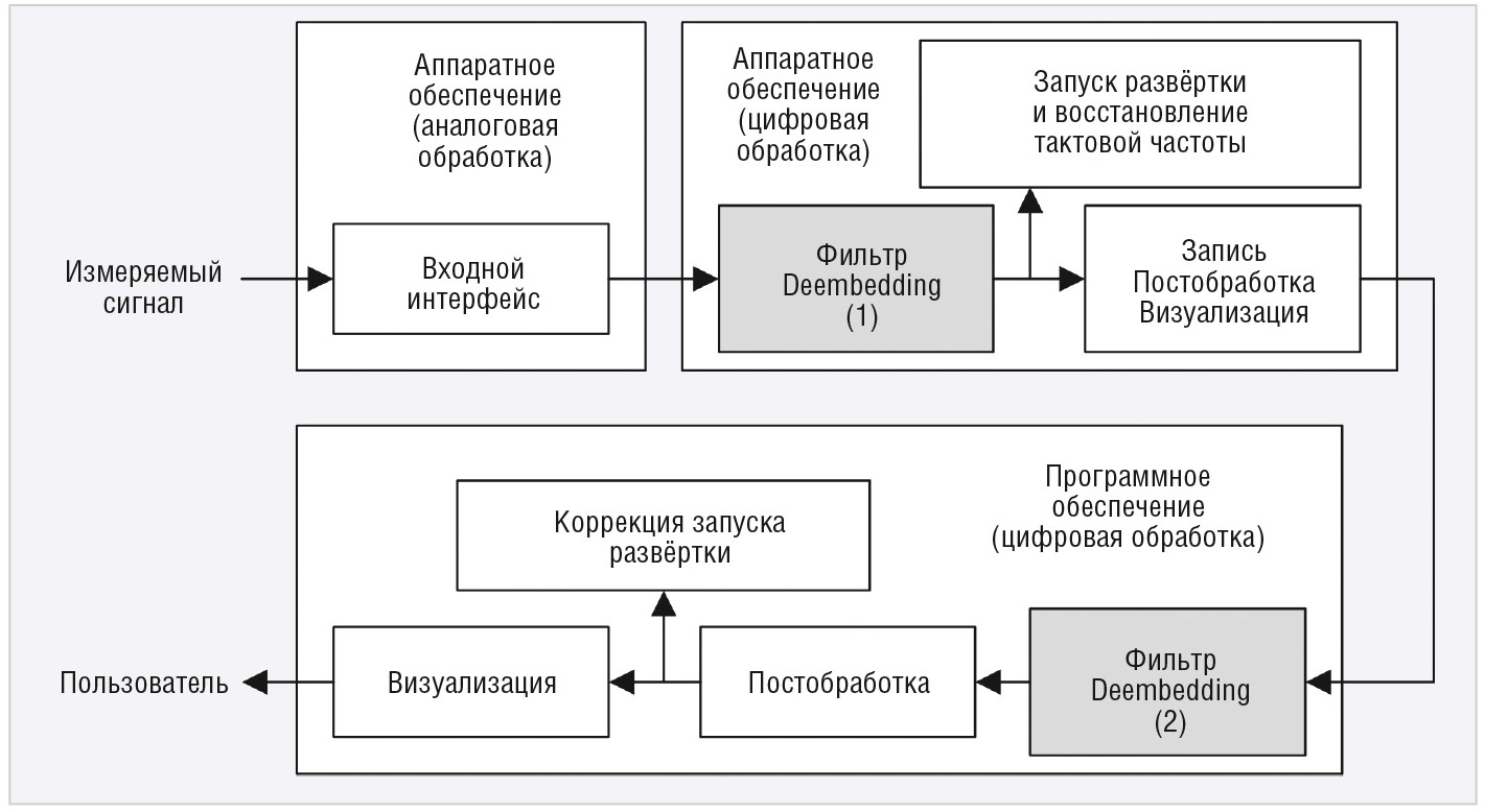 Альтернативная архитектура осциллографа, в которой фильтр Deembedding отсутствует в аппаратной части, предусматривает отображение сигнала после программной коррекции, но запуск развёртки осуществляется по нескорректированному сигналу. Ввиду этого возможно появление расхождения между заданным и наблюдаемым событиями запуска. Таким образом, реализация Deembedding в реальном времени должна считаться приоритетной, в особенности с учётом возможности распределения обработки между аппаратной и программной частью.