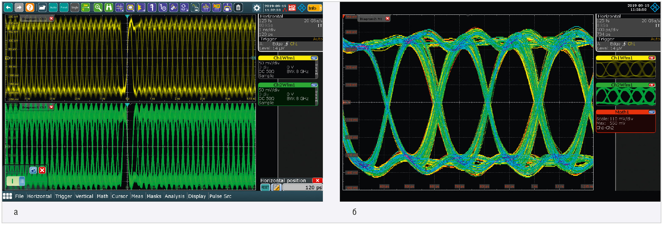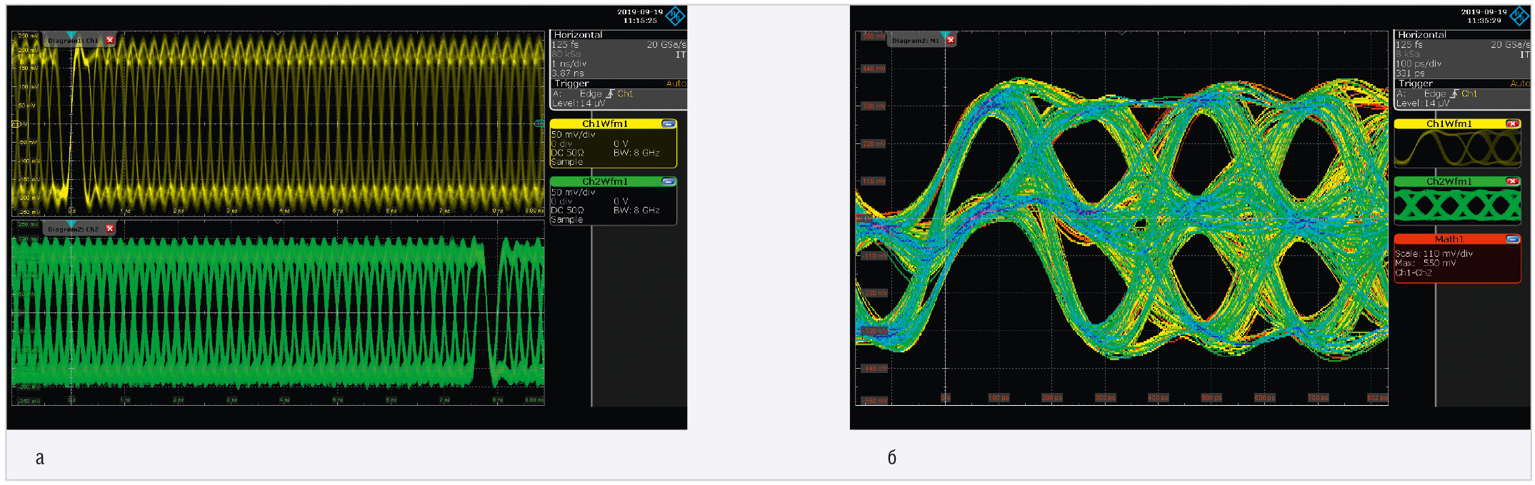 Осциллограмма сигналов в шине SS при активированной функции Deembedding при тех же условиях запуска показана на рисунке 8а. Компенсация свойств используемой оснастки позволила устранить разность по времени запаздывания сигналов, приходящих на каналы 1 и 2 осциллографа, как это видно из сопоставления с рисунком 5а. Кроме того, компенсированы и потери в кабеле: теперь максимальное напряжение для каналов 1 и 2 составляет около 245 и 253 мВ. На рисунке 8б показан полученный дифференциальный сигнал, для которого установленные спецификацией требования по минимальному раскрытию глазковой диаграммы оказываются выполненными.