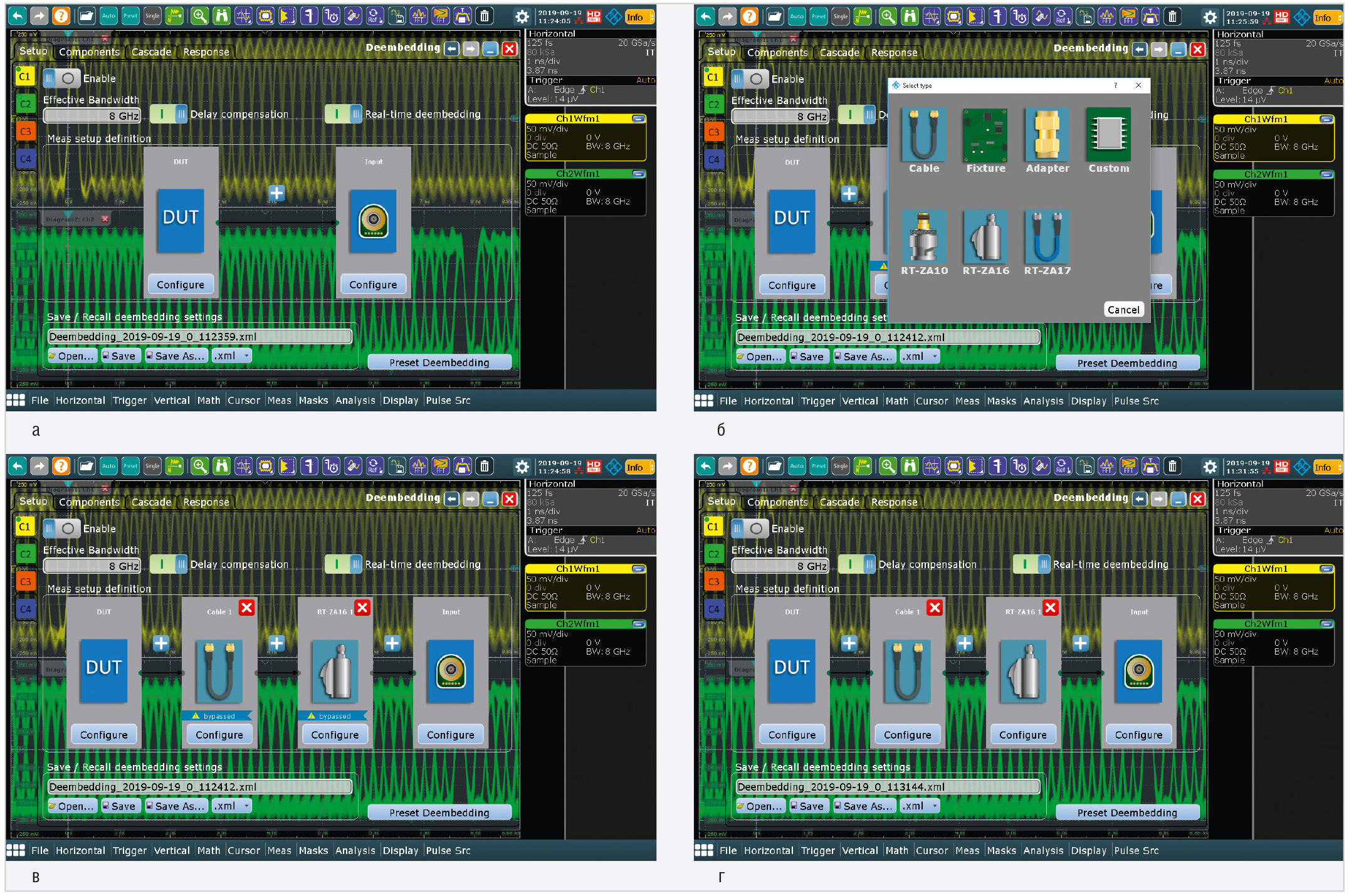 Функция Deembedding в типовых случаях реализуется при помощи специальной вкладки (см. рис. 6а) для каждого канала осциллографа в отдельности, на которой могут быть активированы компенсация задержки и режим реального времени. Для выбора дополнительного элемента оснастки достаточно нажать пиктограмму с символом «+», в результате чего откроется окно, показанное в середине на рисунке 6б. В нижнем ряду перечислены стандартные переходники и кабели, которые поставляет компания Rohde&Schwarz, причём их характеризация уже записана в памяти осциллографа. Основными типами оснастки являются кабели, переходники и платы, при необходимости можно сконфигурировать описание элемента со специальными свойствами. После добавления адаптера R&S RT-ZA и кабеля вкладка конфигурирования функции Deembedding для отдельного канала приобретает вид, показанный на рисунке 6в. Метка bypassed означает, что при реализации функции Deembedding данный элемент оснастки будет игнорироваться, поскольку не загружен файл с его S-параметрами. После их загрузки конфигурирование завершается (см. рис. 6г).