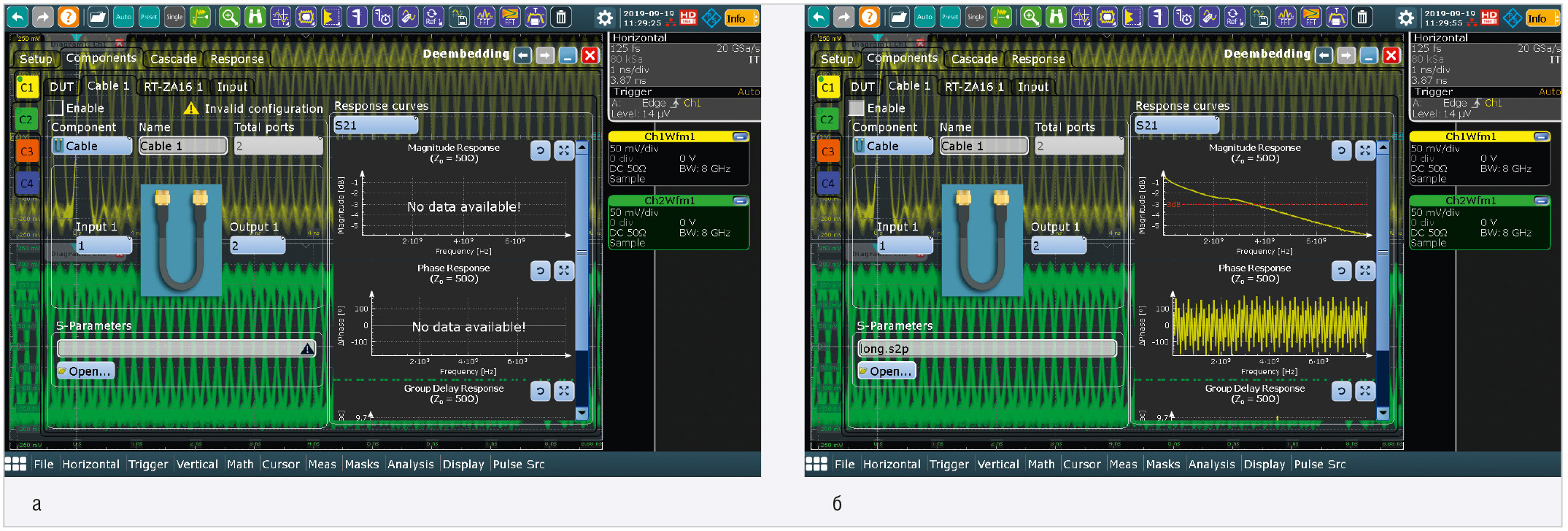 Перед проведением измерений для длинного и короткого кабелей при помощи векторного анализатора цепей типа R&S ZVA были сняты зависимости S-параметров от частоты, сохранённые в стандартные файлы «.S2P», которые могут быть использованы опциями R&S RTP-K121 и RTP-K122 для реализации функции Deembedding. К настоящему времени компания Rohde&Schwarz готовит к представлению на рынке аппаратно-программную опцию для осциллографов R&S RTP, которая позволит снимать характеризацию компонентов измерительной оснастки без привлечения других средств измерений.