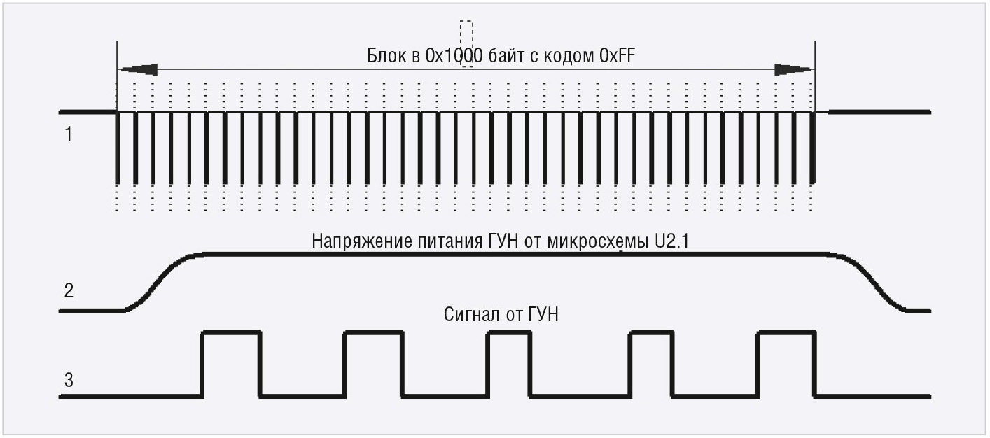 Сформированный модулированный по И-ИЛИ сигнал принимается в UART по линии RXD. На рисунке 3 приведены диаграммы зависимости работы ГУН от передаваемого блока: