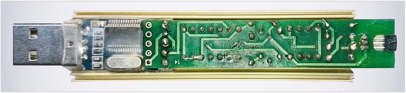 Внешний вид магнитометра показан на рисунке 4. Прибор с разъёмом USB может быть размещён в небольшом корпусе, выполненном, например, из короба кабель-канала. Слева показан готовый блок на печатной плате – модуль USB-UART. На печатной плате справа показан равный по ширине, но значительно более длинный модуль, который содержит все компоненты схемы.