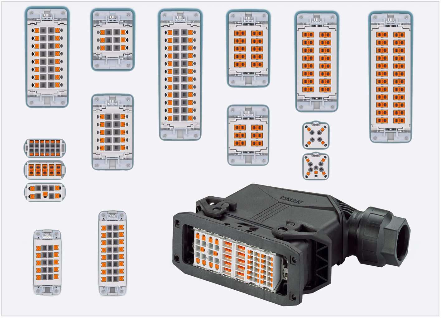 В промышленных разъёмах применяются различные контактные вставки с неизменяемым количеством полюсов, а также наборные, устанавливаемые в ряд модули. Подключение проводников производится на основе различных технологий: с использованием винтовых и пружинных зажимов, а также обжимных контактов.