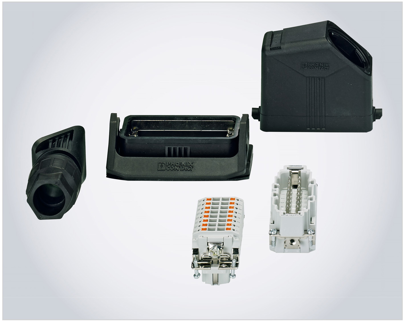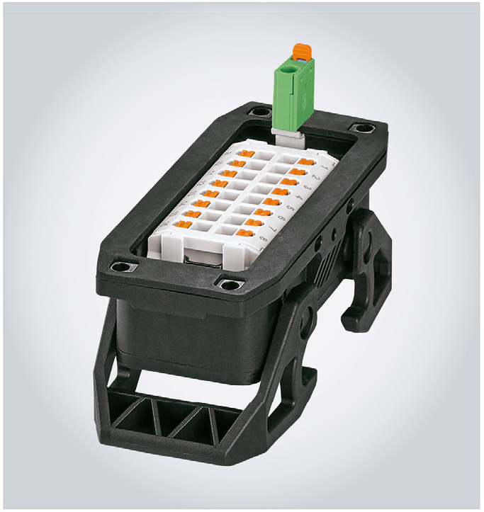 Каждый разъём состоит из множества отдельных компонентов, независимо от используемой технологии подключения. Корпуса серии HC-EVO (см. рис. 4), предлагаемые Phoenix Contact в дополнение к стандартным сериям HC-STA, имеют поворотный кабельный вывод. Благодаря наличию поворотных кабельных вводов с байонетным зажимом, в разы сокращено количество версий кабельных корпусов, требующихся для заказа. Кабельный ввод с байонетным креплением на корпусе разъёма позволяет реализовать боковой или верхний отвод кабеля от разъёма.