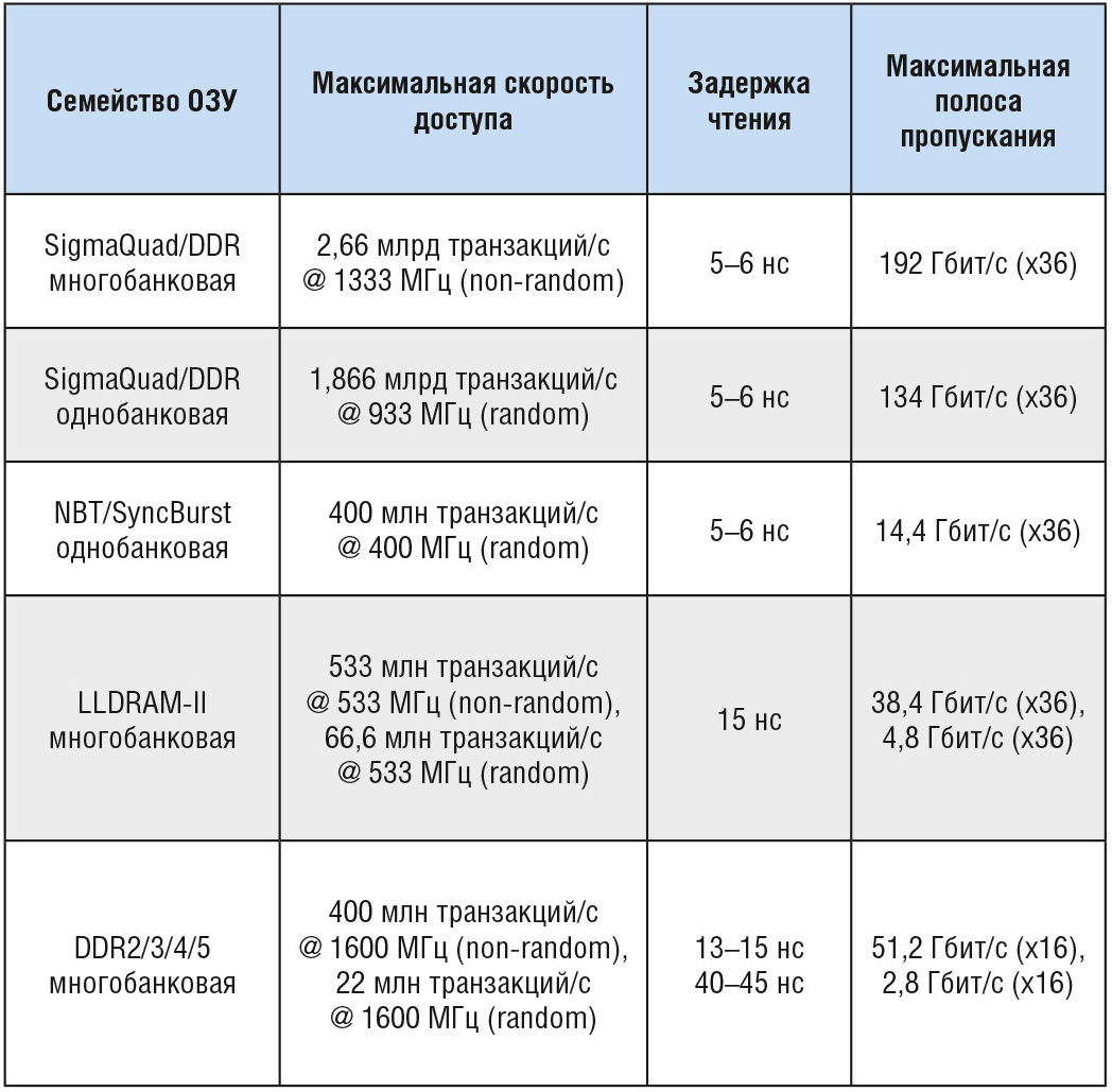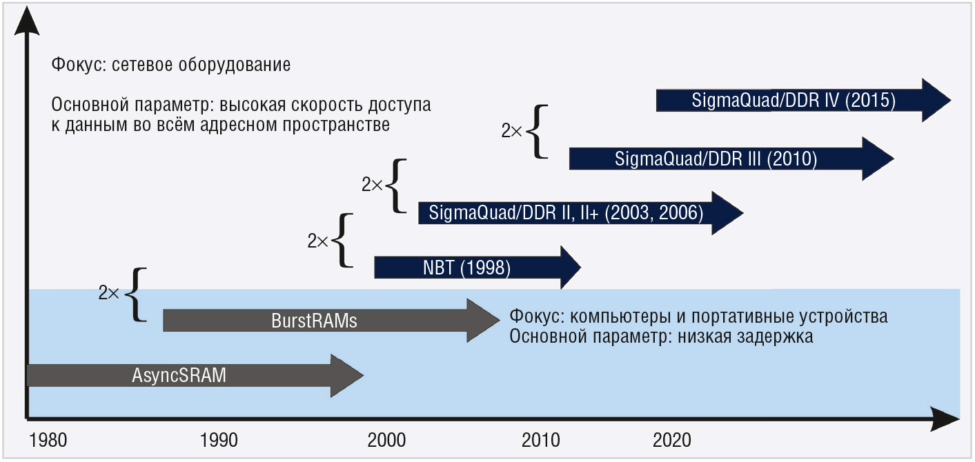 Термин «высокая производительность» можно трактовать по-разному. Интересно, как на рынке сетевого оборудования менялось его понимание. Раньше основным параметром статической памяти была задержка чтения (Read Latency) между тем, как адрес отправлен, и тем, когда данные были выданы из памяти. Задержка записи не принимается в расчёт, так как она примерно одинаковая у SRAM и DRAM (DDR2/3/4/5). Затем производители памяти сконцентрировали своё внимание на достоверности данных и частоте тактирования. Дело в том, что с увеличением объёма информации, которую необходимо сохранять в SRAM, производители сетевого оборудования начали оценивать память по полосе пропускания.