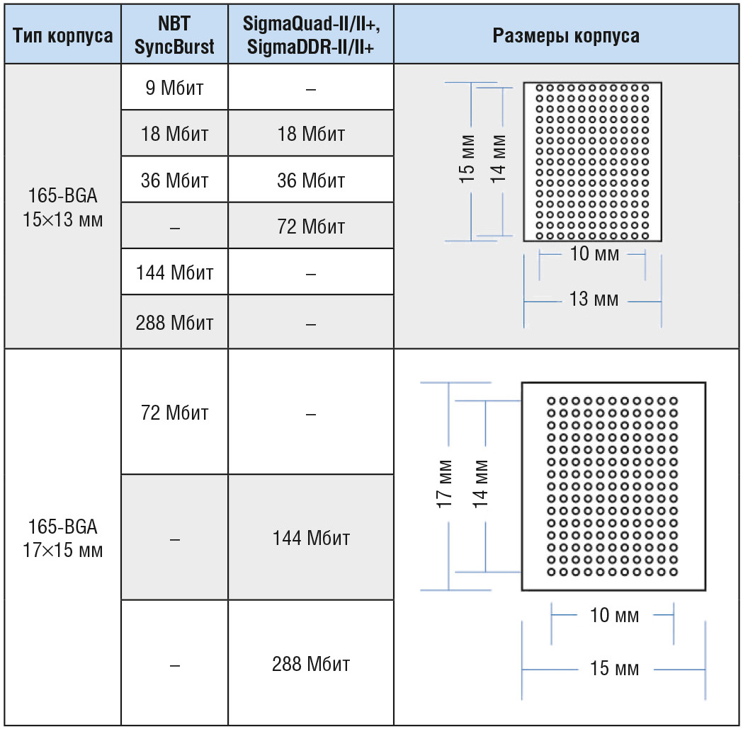 Большой объём не всегда означает применение большого корпуса. Из таблицы 1 видно, что микросхемы семейства NBT и SyncBurst объёмом 144 Мбит и 288 Мбит выпускаются в меньшем корпусе, чем 72 Мбит. На сегодняшний день корпус 165-BGA 15×13 мм является самым компактным корпусом у всех производителей. GSI Technology является единственным производителем статической памяти, который поставляет микросхемы в BGA-корпусах с содержанием свинца.