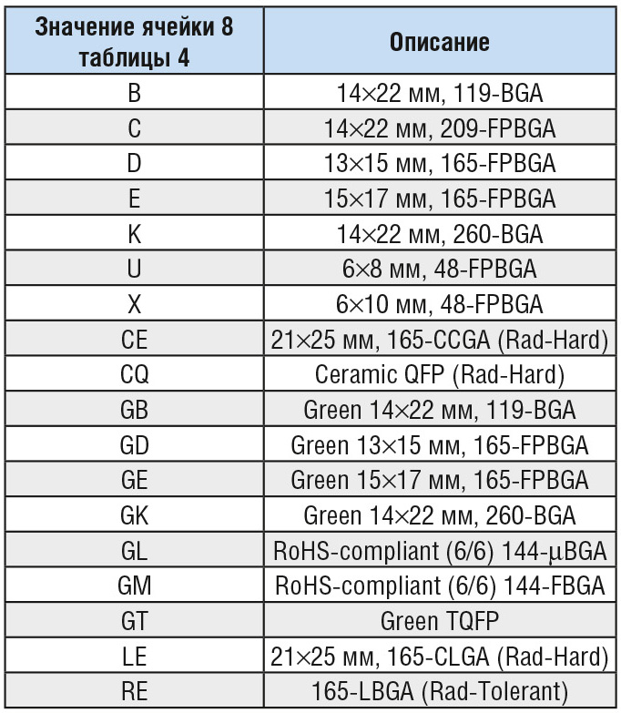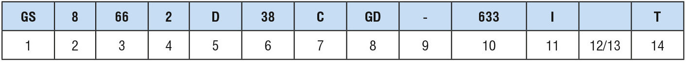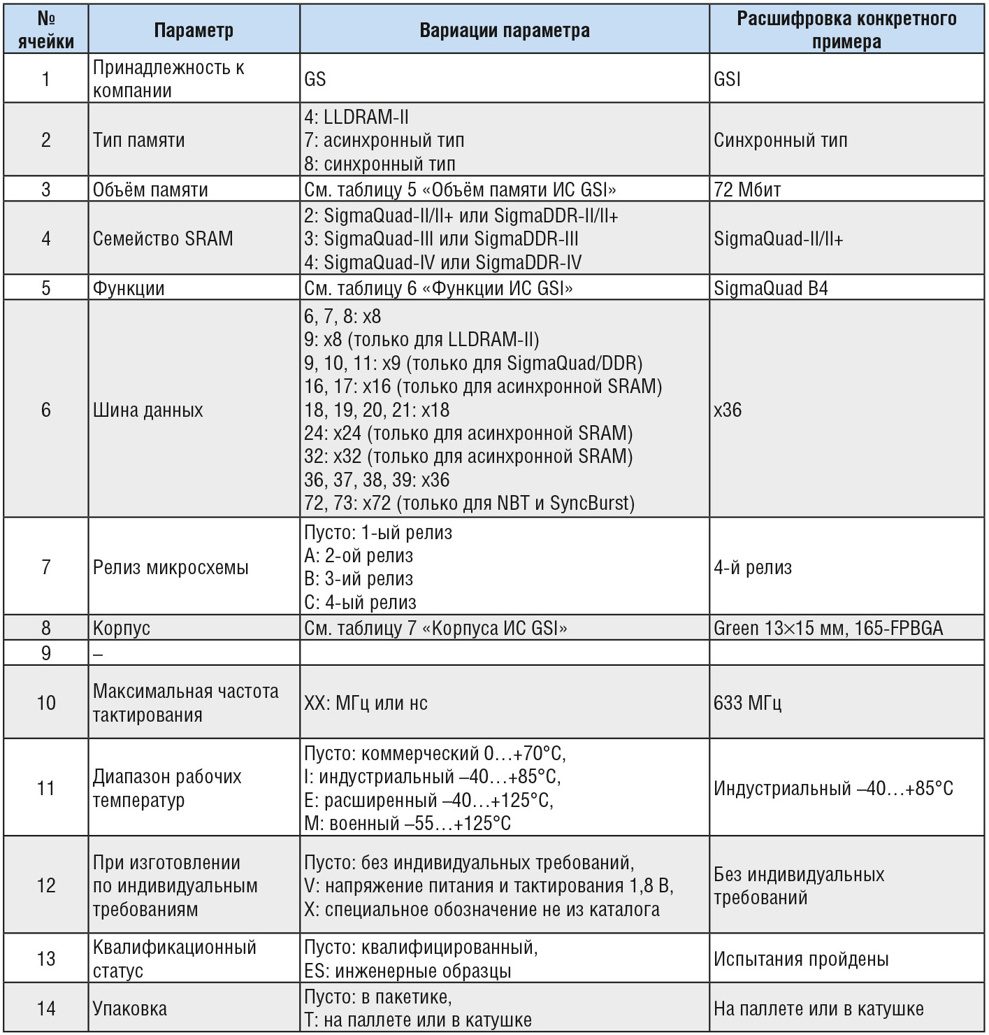В таблицах 3–7 приведена расшифровка децимального номера GS8662D38CGD-633IT.