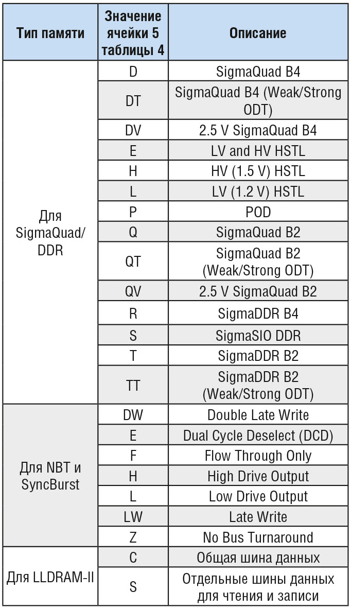 c) если в микросхеме реализован блок коррекции ошибок ECC, то число инкрементируется ещё на единицу; - децимальные номера семейств SigmaQuad-II/III/IV и SigmaDDR-II/III/IV в четвёртом символе имеют значения «2», «3» и «4» соответственно.